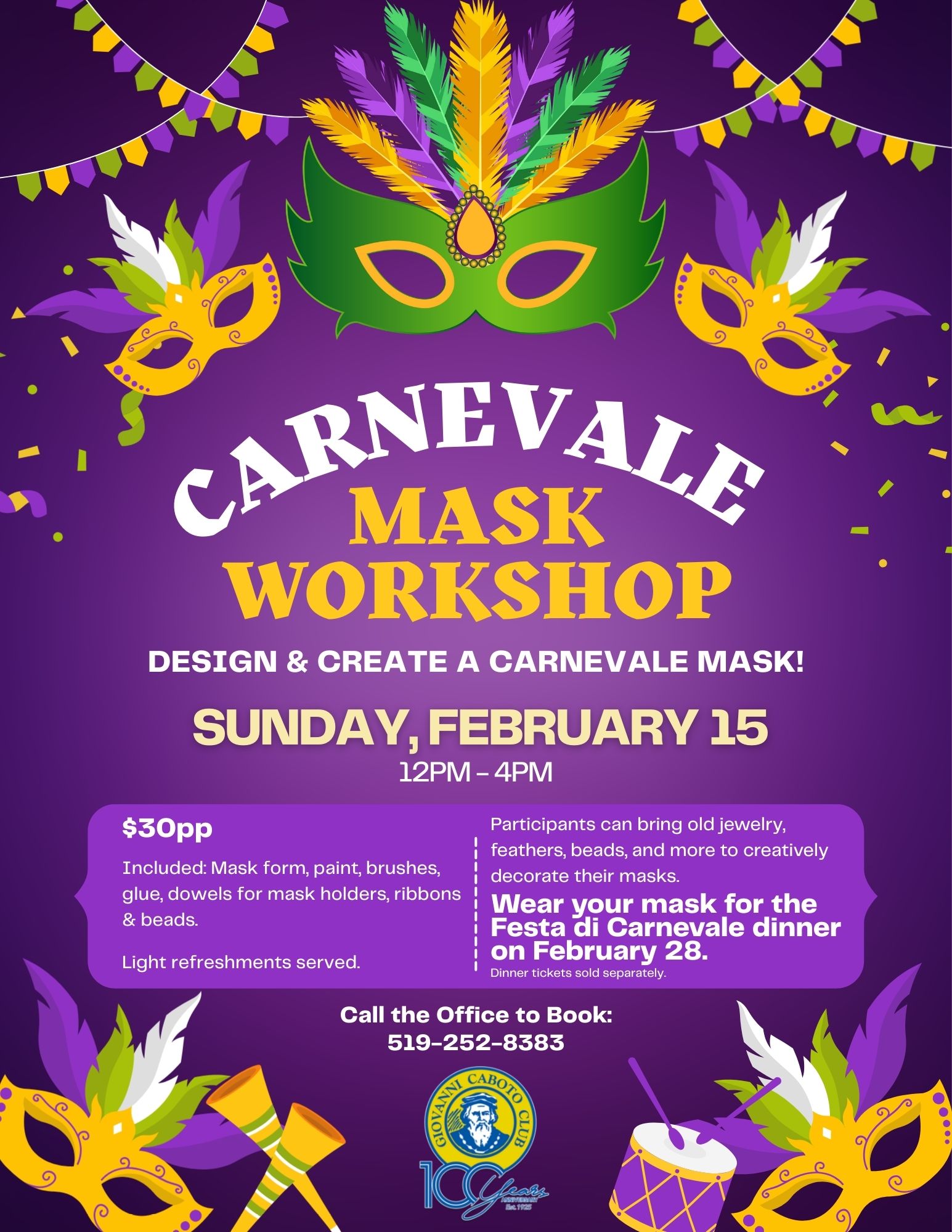 Join us for a creative and festive afternoon as the Giovanni Caboto Club hosts a Carnevale Mask Workshop, where participants will design and decorate their very own traditional Carnevale mask in preparation for our upcoming Festa di Carnevale Dinner.